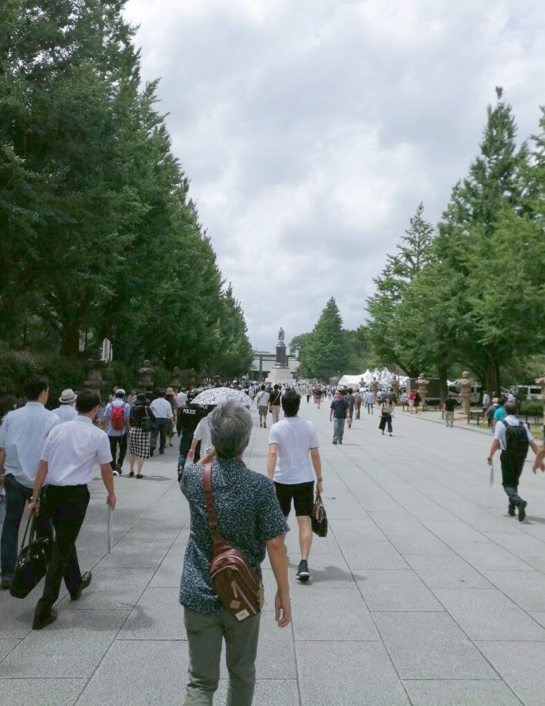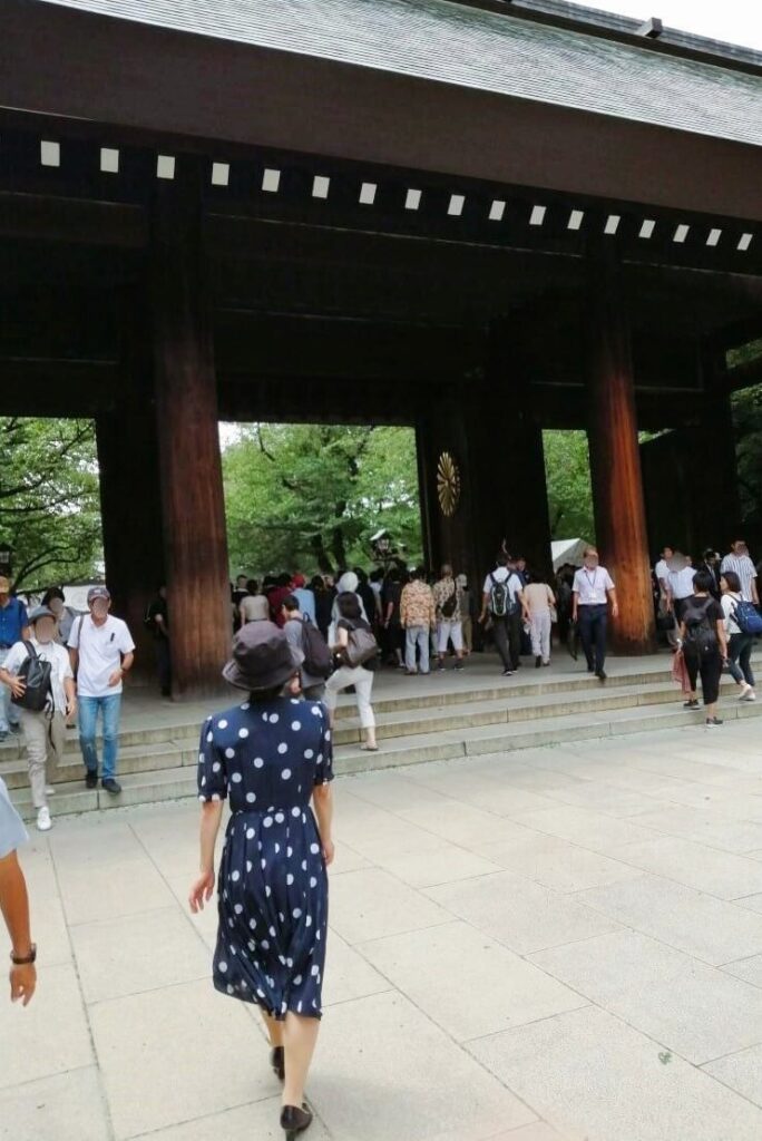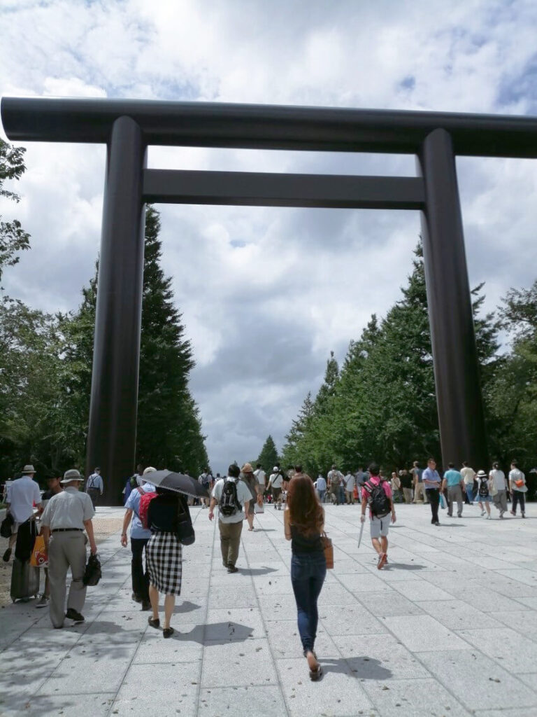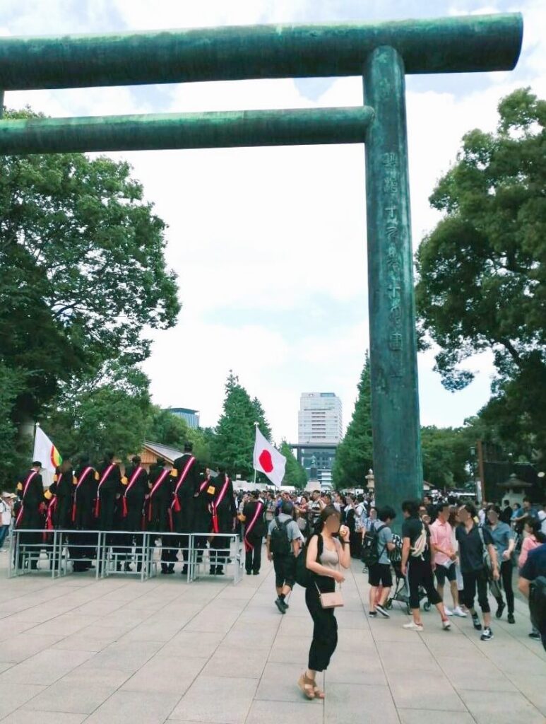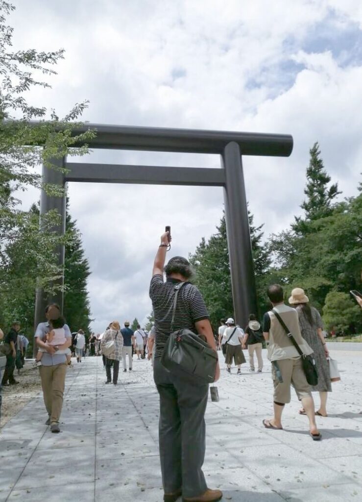 本殿にほど近い記念写真の台には、海外から来た方々が英霊のメモリアルデーにハイチーズ。
