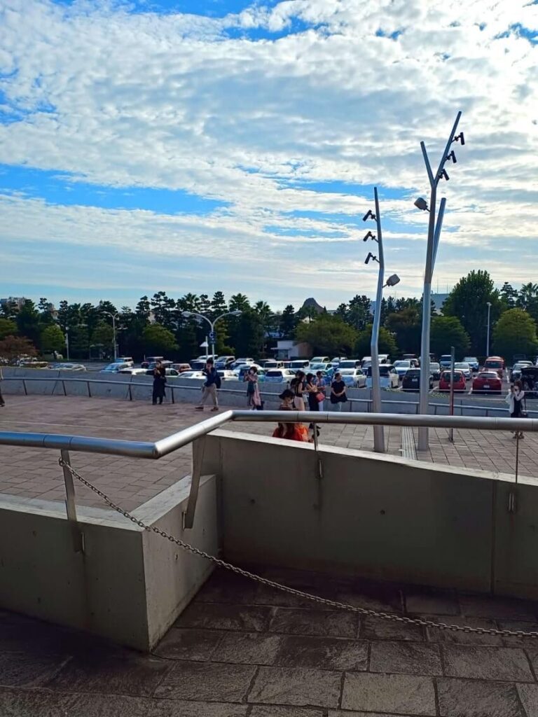 劇場前の駐車場と秋の空